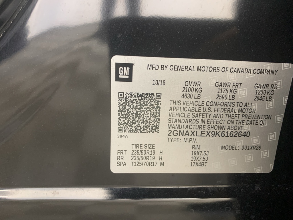 Confidence and Convenience Package. Driver Confidence Package: Rear Cross Traffic Alert; Rear Park Assist with Audible Warning; Outside Heated Power-Adjustable Mirrors; Lane Change Alert with Side Blind Zone Alert. Driver Convenience Package: Remote Vehicle Starter System; Leather-Wrapped Shift Lever; Rear Power Liftgate; Dual Zone Automatic Climate Control; Heated Driver and Front Passenger Seats; 3-Spoke Leather-Wrapped Steering Wheel; Universal Home Remote. Redline Edition: P235/50R19 All-Season Blackwall Tires; Redline Specific Black Grille; Front and Rear Black Bowtie Emblems; Black Equinox Badges with Red Outline; Mosaic Black Mirror Caps; Roof-Mounted Luggage Carrier Provisions; 19" Aluminum Wheels; Outside Heated Power-Adjustable Mirrors. Preferred Equipment Group 2LT: 4-Wheel Antilock 4-Wheel Disc Brakes; Body-Color Trailer Hitch Close-Out Cover; Dual Stainless-Steel Exhaust with Bright Tips; Factory Installed Trailer Hitch; T125/70R17 BW Compact Spare Tire; 17" Steel Spare Wheel; 2.0L Turbo 4-Cylinder SIDI VVT Engine; Trailering Equipment; 3.17 Final Drive Axle Ratio; Electronic 9-Speed Automatic Transmission with Overdrive. Floor Liner Package: Integrated Cargo Liner; All-Weather Floor Liners. Infotainment Package: HD Rear Vision Camera; 2 USB Data Ports; 120-Volt Power Outlet; 2 USB Data Ports with SD Card Reader; Chevrolet Infotainment 3 Plus System Radio with Navigation. Roof Rack Cross Rails. Set of 4 Wheel Locks. Front License Plate Mounting Package. **Equipment listed is based on original vehicle build and subject to change. Please confirm the accuracy of the included equipment by calling the dealer prior to purchase.**
