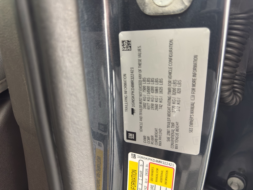 Max Trailering Package: Extra Capacity Cooling System. Advanced Trailering Package: Advanced Trailering System; Integrated Trailer Brake Controller; Hitch Guidance with Hitch View. Off-Road Capability Package: Enhanced Driver Information Center; Magnetic Ride Control Suspension; Air Ride Adaptive Suspension. Driver Alert Package: Lane Keep Assist with Lane Departure Warning; Rear Cross Traffic Alert; Front and Rear Park Assist; Lane Change Alert with Side Blind Zone Alert. Luxury Package: HD Surround Vision; Heated 2nd Row Outboard Seats; 2nd Row Power Release 60/40 Split-Folding Bench Seat; Memory Settings; Power Tilt and Telescopic Steering Column; Rear Pedestrian Alert; Automatic Heated Steering Wheel; 3rd Row 60/40 Power-Folding Split-Bench Seat; Outside Heated Power-Adjustable Mirrors. Z71 Off-Road Package. Preferred Equipment Group 2Z7: Bright Front and Rear Door Sill Plates; Leather Seat Trim; Remote Start; Hill Descent Control; 20" X 9" Machined Aluminum Wheels; Floor Console with Storage Area; Black Tubular Assist Steps; LED Daytime Running Lamps; Driver and Front Outboard Passenger Airbags; Memory Settings For Driver; Front High-Back Reclining Bucket Seats; Universal Home Remote; Color-Keyed Carpeting Floor Covering; Front Skid Plate; Front High-Approach Angle Fascia; Hands-Free Rear Power Programmable Liftgate; 2-Speed Active Electronic Autotrac Transfer Case; 1st and 2nd Row Color-Keyed Carpeted Floor Mats; Chevrolet Infotainment 3 Plus System Radio; HD Radio; Red Horizontal-Mounted Recovery Hooks; SiriusXM Radio with 360L; Leather-Wrapped Steering Wheel; 275/60R20SL AT BW Tires; Infotainment Display; Auto-Dimming Inside Rearview Mirror; 2 USB Data Ports. Power Release 2nd Row Bucket Seats. **Equipment listed is based on original vehicle build and subject to change. Please confirm the accuracy of the included equipment by calling the dealer prior to purchase.**