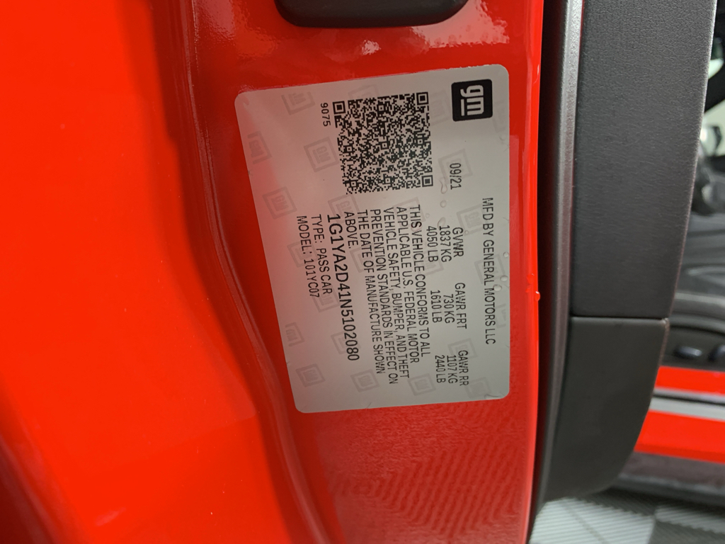 Anti-lock brakes are standard on this model. It comes equipped with Android Auto for seamless smartphone integration on the road. This 2022 Chevrolet Corvette offers Apple CarPlay for seamless connectivity. This small car offers Automatic Climate Control for personalized comfort. The high efficiency automatic transmission shifts smoothly and allows you to relax while driving. Engulf yourself with the crystal clear sound of a BOSE sound system in this small car. See what's behind you with the back up camera on the Chevrolet Corvette. This Chevrolet Corvette has a clean CARFAX vehicle history report. The Chevrolet Corvette has gone through a stringent manufacturer pre-owned certification process, including a meticulous mechanical and reconditioning processes. Take the stress out of car buying with this certified pre-owned. Set the temperature exactly where you are most comfortable in this Chevrolet Corvette. The fan speed and temperature will automatically adjust to maintain your preferred zone climate. The Chevrolet Corvette features cruise control for long trips. Electronic Stability Control is one of many advanced safety features on this model. This unit has a V8, 6.2L high output engine. Enjoy the tried and true gasoline engine in it. This vehicle features a hands-free Bluetooth phone system. The leather seats in this 2022 Chevrolet Corvette are a must for buyers looking for comfort, durability, and style. This vehicle is outfitted with an OnStar communication system. The state of the art park assist system will guide you easily into any spot. The Chevrolet Corvette is accented with a stylish rear spoiler. It is rear wheel drive. This vehicle gleams with a flashy red exterior. Never get into a cold vehicle again with the remote start feature on this Chevrolet Corvette. Small and nimble this vehicle scoots through traffic. It offers great fuel mileage and ease of parking.